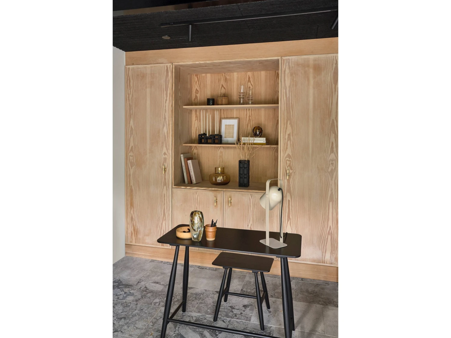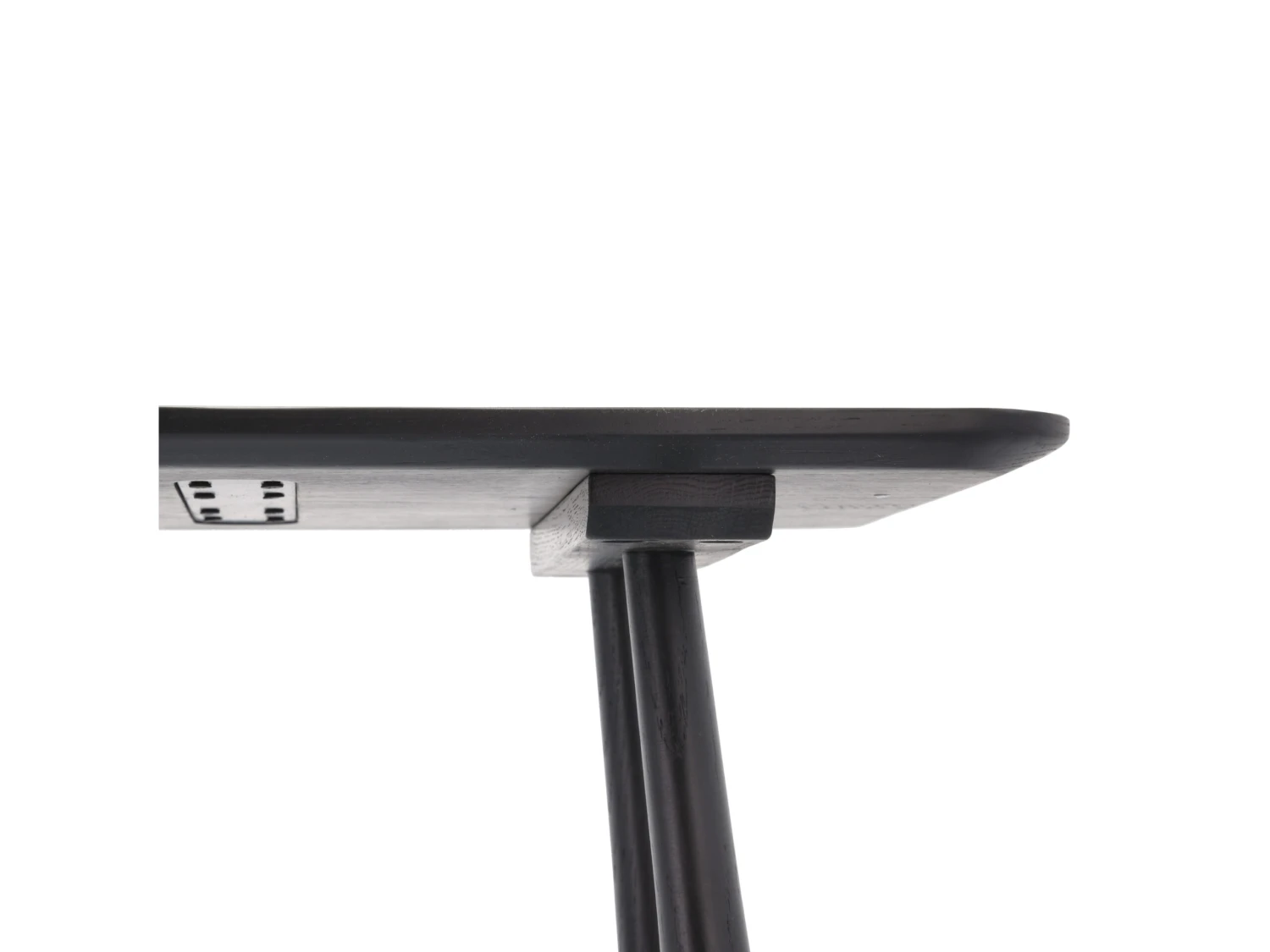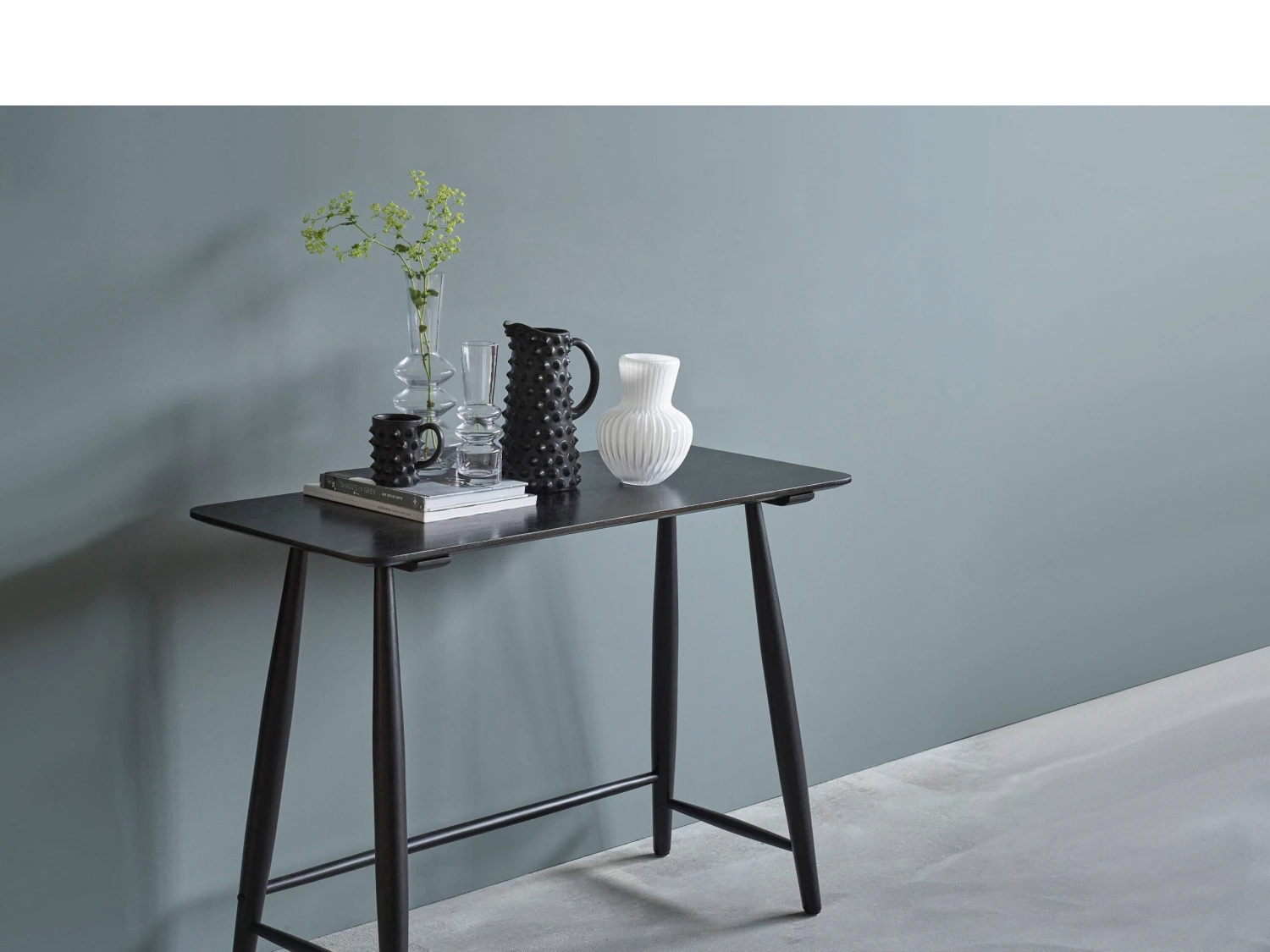 Schreibtisch aus schwarzlackierter Eiche. Der schmale Tisch ist aus wunderschönem Eichenholz hergestellt, und das schlichte, stilvolle Design passt perfekt zu einer skandinavischen Einrichtung mit entspannter Atmosphäre. Für die Verwendung im Innenbereich.