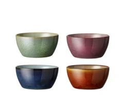 4 Stück. 12 cm Schalen aus Steinzeug mit glänzender Außenseite und glänzender Innenseite in verschiedenen Farben. Die Schalen messen 12 cm im Durchmesser und sind 6 cm hoch. Eine perfekte Größe für viele Dinge, vom Frühstück und Snacks über Saucen bis hin zu Kleingebäck, Schokolade, Beeren und Fruchtstücken. Die vier Farbkombinationen sind Lila/Hellrosa, Dunkelgrün/Hellgrün, Amber/Creme und Dunkelblau/Hellblau.