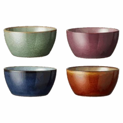 4 Stück. 12 cm Schalen aus Steinzeug mit glänzender Außenseite und glänzender Innenseite in verschiedenen Farben. Die Schalen messen 12 cm im Durchmesser und sind 6 cm hoch. Eine perfekte Größe für viele Dinge, vom Frühstück und Snacks über Saucen bis hin zu Kleingebäck, Schokolade, Beeren und Fruchtstücken. Die vier Farbkombinationen sind Lila/Hellrosa, Dunkelgrün/Hellgrün, Amber/Creme und Dunkelblau/Hellblau.