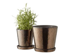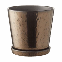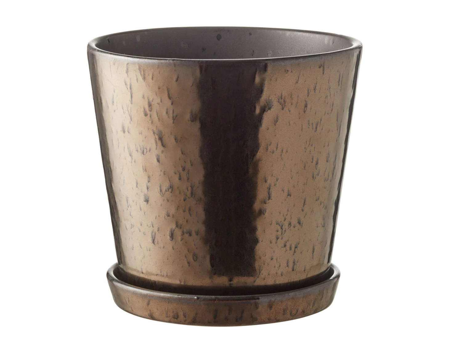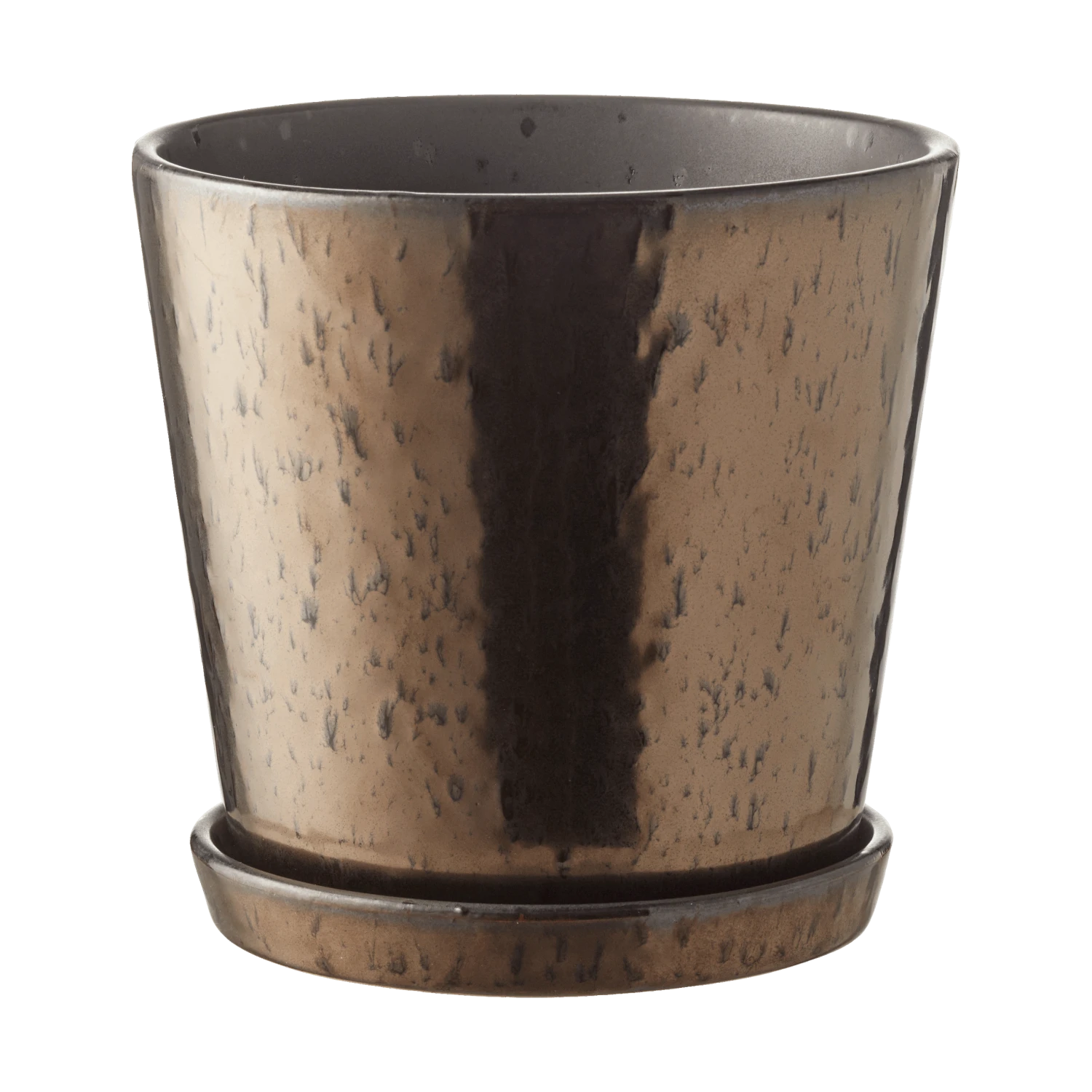 Der Übertopf aus Steinzeug mit passendem Untersetzer hat eine glänzende, bronzefarbene Glasur auf der Außenseite und eine matte, schwarze Glasur auf der Innenseite. Stellen Sie Kräuter oder Zimmerpflanzen in den Übertopf und schaffen Sie eine hübsche, grüne Stimmung auf der Fensterbank. Durchmesser 14 cm und Höhe 12,5 cm.