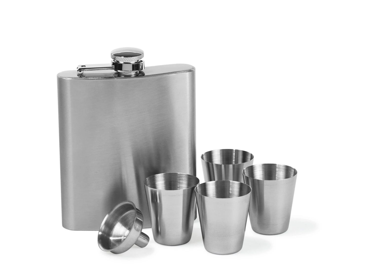 Funktionelles 6-teiliges Flachmann-Set aus 18/10 Edelstahl mit mattem Finish. Der Flachmann passt auf der Jagd oder auf einer Wanderung im Wald perfekt in die Innentasche der Jacke. Das Set enthält einen Flachmann mit 200 ml, 4 Trinkbecher mit 30 ml und einen praktischen Trichter zum Füllen der Flasche.
