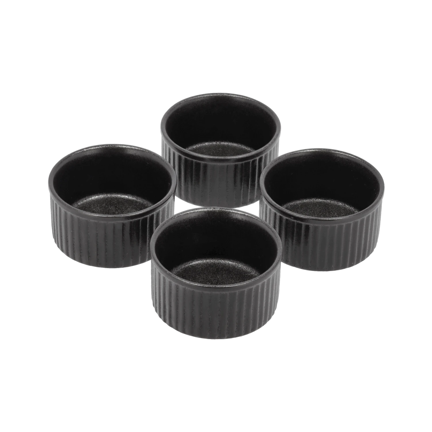 4 HOLM Ramekinformen aus schwarz glasiertem Steinzeug. Durchmesser 7 cm, Höhe 3,5 cm. Die Ramkinformen eignen sich für Soufflé, Gratin, Pastete, Marmelade, Tapenade und das Servieren in Portionen.
