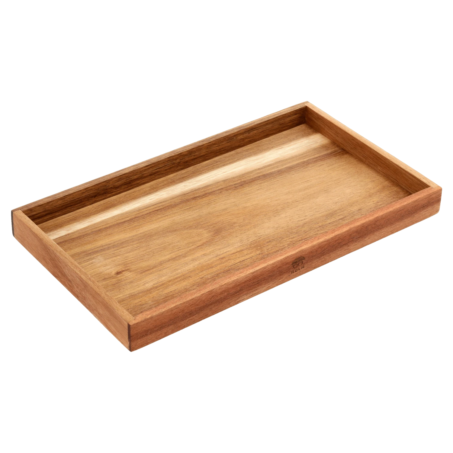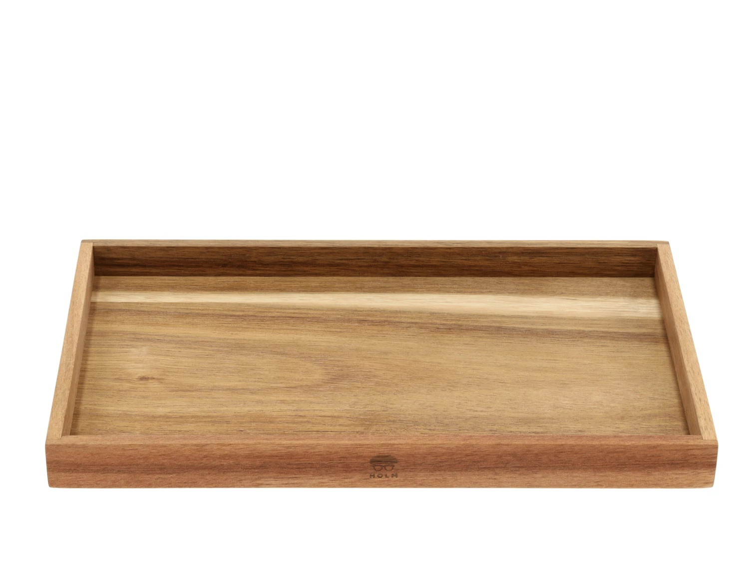 Tablett aus Akazienholz. Für die Verwendung des Tabletts in der Küche sind der Phantasie keine Grenzen gesetzt. Es eignet sich perfekt, um Öle, Essig, Gewürze und Kräuter darauf zu stellen und zum Servieren von Snacks. 35 x 20 x 3 cm.