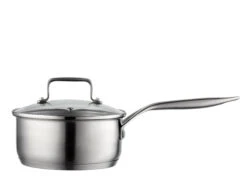 Pfanne-/Topf-Set, 5 Teile. Dieses perfekte Starterset besteht aus einem 1,3 l Topf mit Deckel, Durchmesser 16 cm, einem 1,7 l Topf mit Deckel, Durchmesser 18 cm und einer 24 cm Bratpfanne. Die Serie 79NORD ist aus 18/8 Edelstahl hergestellt und die Glasdeckel haben ein Dampfloch.