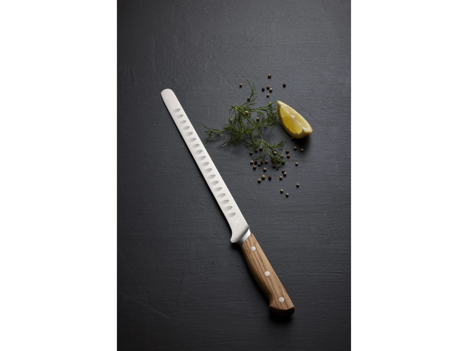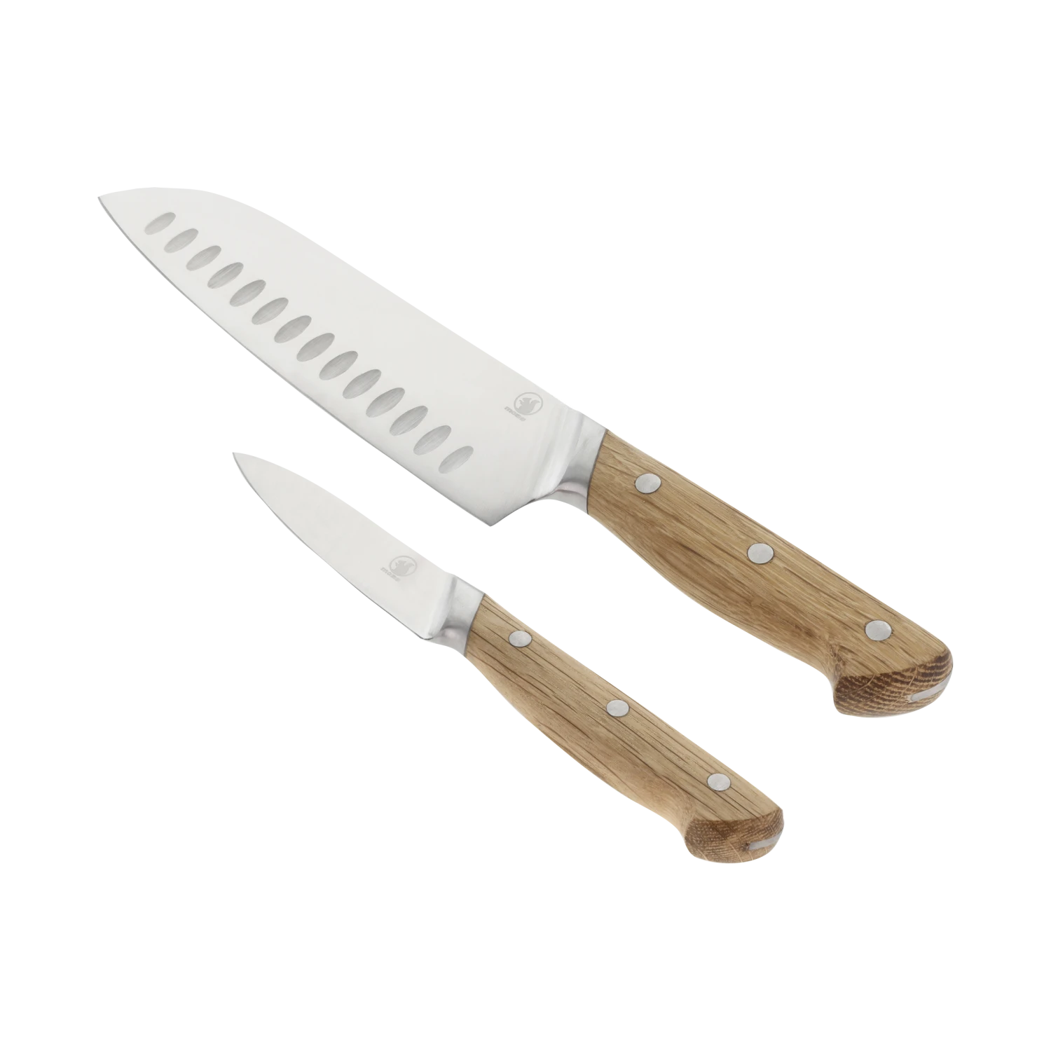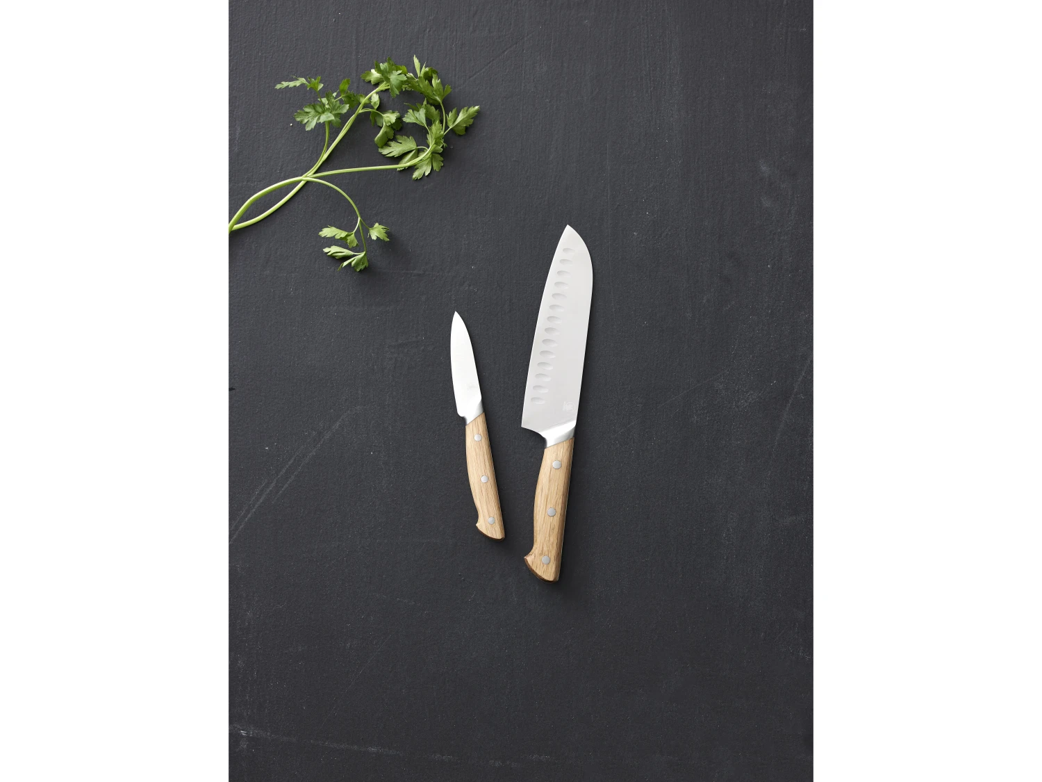 Das Messerset mit Santokumesser und Kräutermesser ist das perfekte, vielseitige Messerpaar für die Küche. Die Messerklingen bestehen aus hochwertigem Edelstahl und die Griffe aus geölter Eiche, die bei Gebrauch Patina entwickelt und einfach schöner wird, je öfter die Messer verwendet werden. Der Holzgriff ist aus einem Stück Holz gefertigt und liegt angenehm in der Hand. Das Santoku-Messer ist mit Kullen (Mulden) versehen, die sicherstellen, dass das Schneidgut nicht an der Klinge haftet.