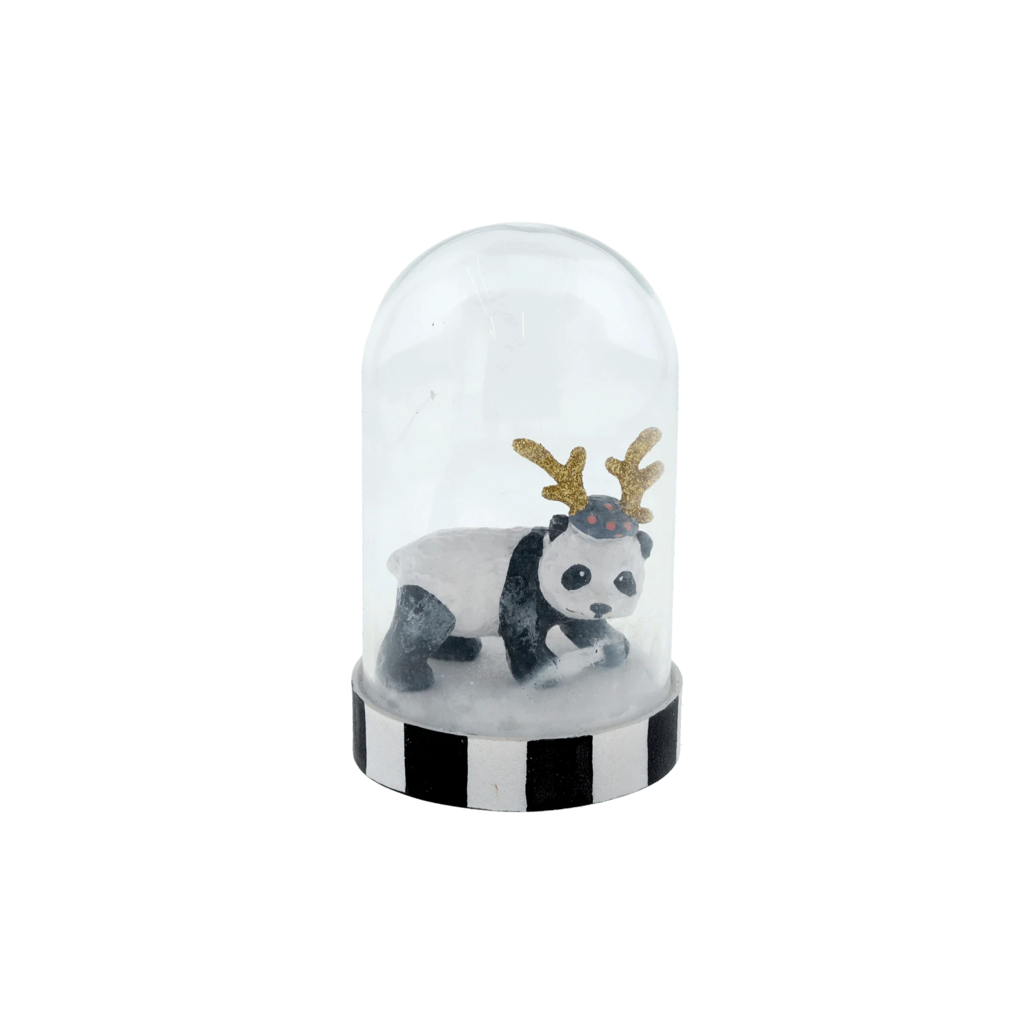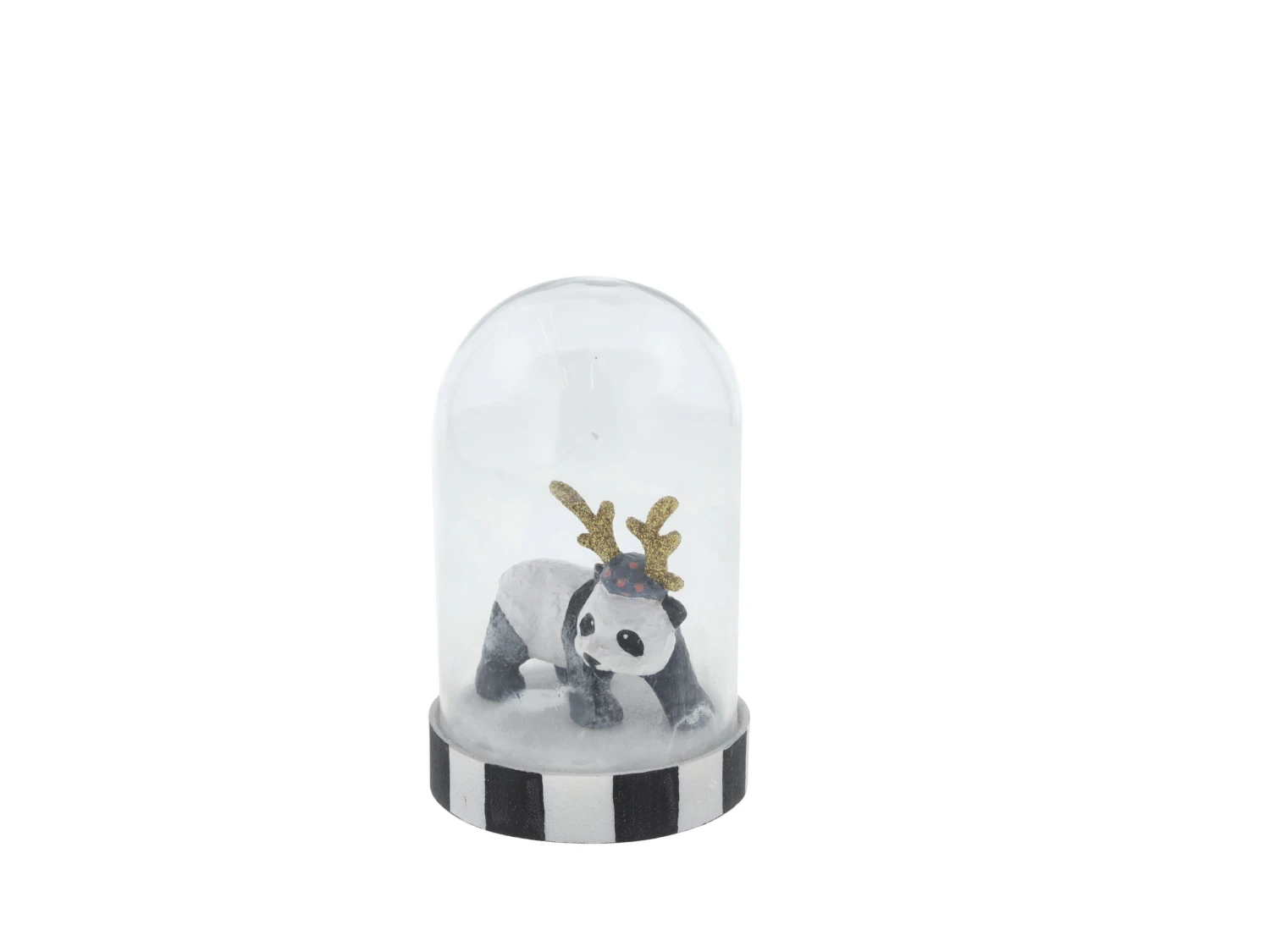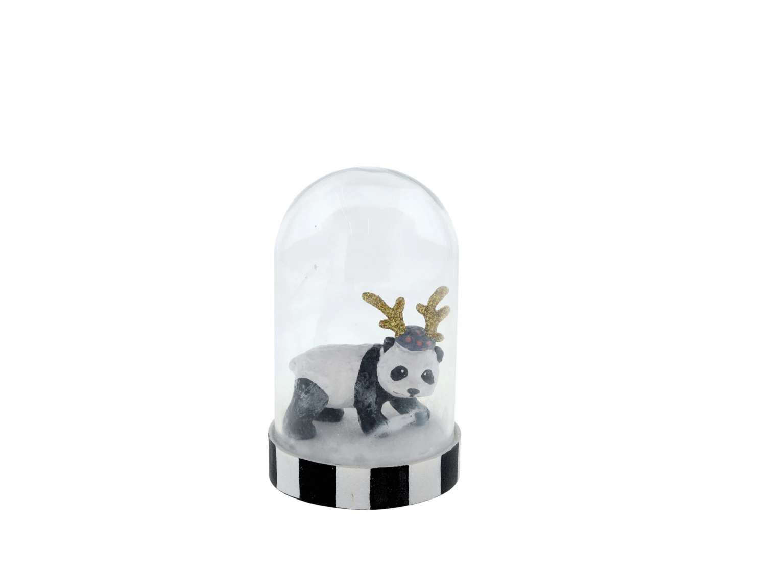 Hier ist unser neuer Freund Peter Panda, der einen besonderen Platz im Haus verdient. Er hat sich mit einem schönen Goldgeweih geschmückt, um wie ein echtes Rentier auszusehen, und in seiner hübschen Glaskuppel weckt er viel Aufmerksamkeit.