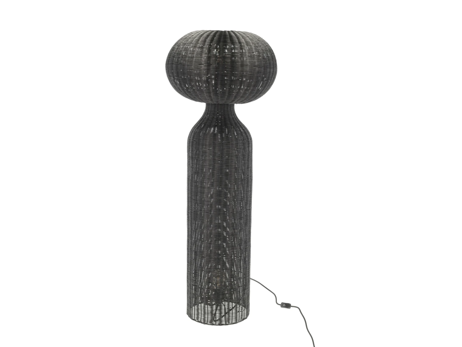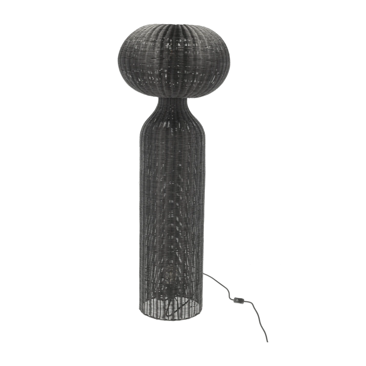 Stehleuchte aus schwarzem Rattan. mit weichem und elegantem Licht. Ein tolles und warm leuchtendes Detail, das in jede kühle skandinavische Einrichtung passt. Mit 3 m langem schwarzem Polyesterkabel und 2 x E27 Fassung. D 50 x H 130 cm.
